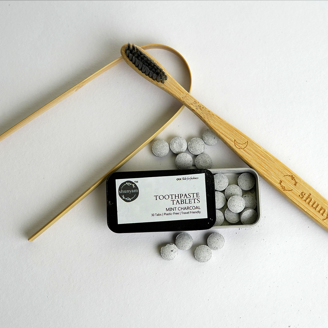 Make your oral care routine clean, conscious, and travel-ready with the Shunyam Sustainable Dental Kit. This all-in-one plastic-free set includes 30 peppermint toothpaste tablets, a soft-bristled bamboo toothbrush, and a stainless steel tongue cleaner—everything you need for a fresh start every day.