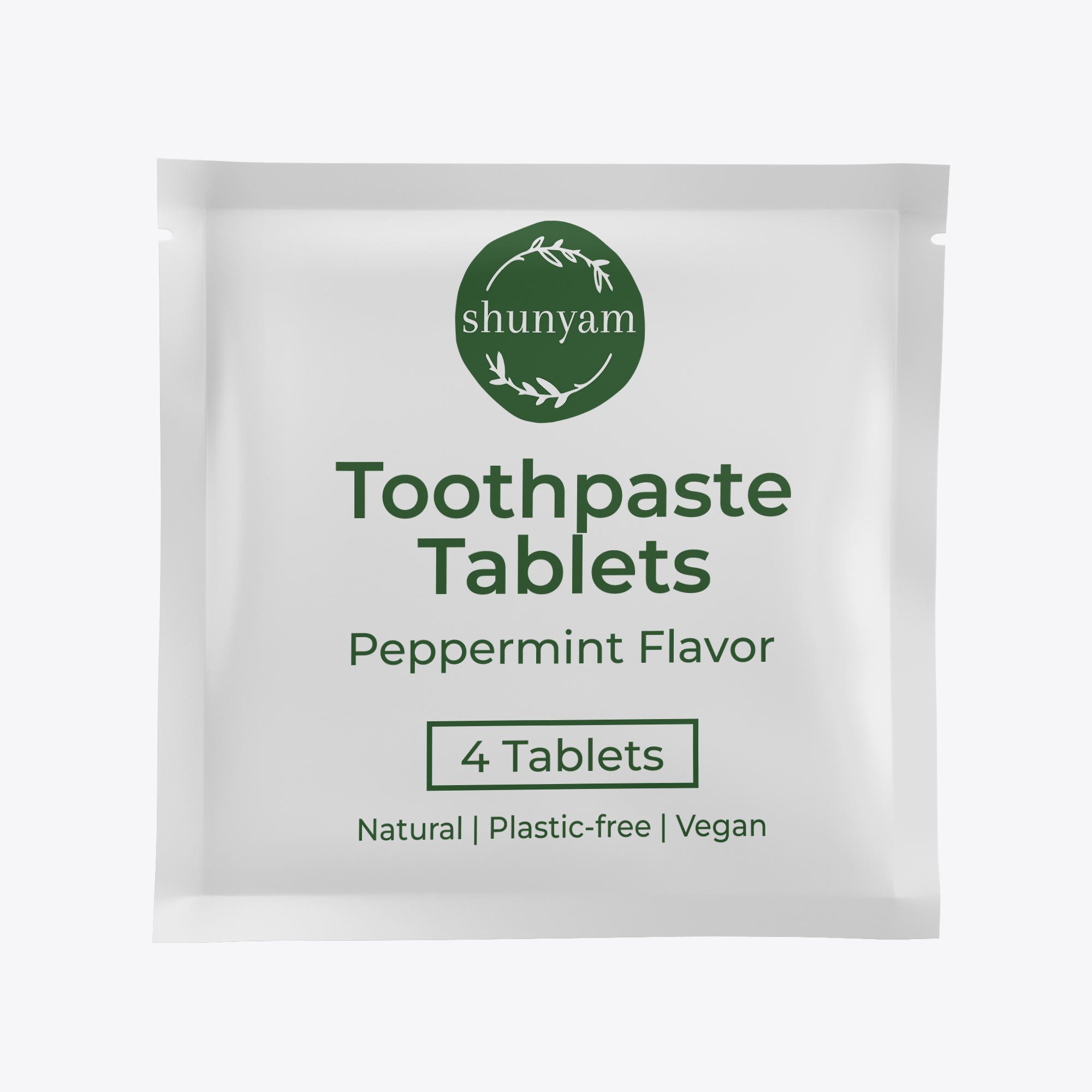 Toothpaste Tabs Peppermint, conveniently packaged in a 100% compostable pouch of 4 tabs each. Embracing sustainability from start to finish, our compostable pouch is crafted using eco-friendly materials and printed with vegetable ink, minimizing environmental impact without compromising on quality. Dive into a refreshing peppermint experience while knowing you're making a difference with every brush. It's time to revolutionize your oral care routine with convenience, freshness, and sustainability at your fingertips.